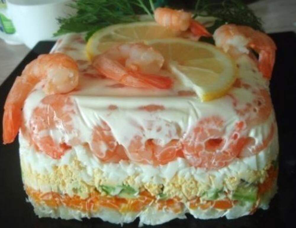Ингредиенты:креветки 500 грприправы для морепродуктовкартофель 1 штморковь 1 штавокадо яйца 2 штсольжелатин 2 ч. л.вода 1/2 стаканамайонез сметанаукрашение:зеленьлимон креветкиПриготовление:Креветки сварить около 3 минут, с добавлением приправы для морепродуктов, соли, лаврового листа и перца... Далее
